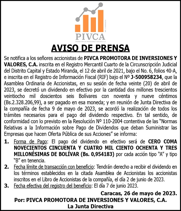Se notifica a los señores accionistas de PIVCA PROMOTORA DE INVERSIONES Y VALORES, C.A. inscrita en el Registro Mercantil Cuarto de la Circunscripción Judicial del Distrito Capital y Estado Miranda, el 12 de abril de 2021, bajo el No. 6, folios 40-A, e inscrita en el Registro de Información Fiscal (RIF) bajo el N° J-500958234, que la Asamblea Ordinaria de Accionistas, en su sesión de fecha veinte (20) de abril de 2023, se decretó un dividendo en efectivo por la cantidad dos millones trescientos veintiocho mil doscientos seis Bolívares con noventa y nueve céntimos (Bs. 2.328.206,99), a ser pagado en esa moneda; y en reunión de Junta Directiva de la compañía de fecha 9 de mayo de 2023, se acordó la realización de todos los trámites necesarios para el pago del dividendo respectivo. En tal sentido, de conformidad con lo previsto en la Resolución N° 110-2004 contentiva de las “Normas Relativas a la Información sobre Pago de Dividendos que deban Suministrar las Empresas que hacen Oferta Pública de sus Acciones” se informa:
