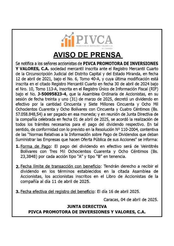 Se notifica a los señores accionistas de PIVCA PROMOTORA DE INVERSIONES Y VALORES, C.A. sociedad mercantil inscrita ante el Registro Mercantil Cuarto de la Circunscripción Judicial del Distrito Capital y del Estado Miranda, en fecha 12 de abril de 2021, bajo el No. 6, Tomo 40-A, y cuya última modificación está inscrita en el citado Registro Mercantil Cuarto en fecha 30 de abril de 2024 bajo el Nro. 10, Tomo 113-A, inscrita en el Registro Único de Información Fiscal (RIF) bajo el No. J-500958234, que la Asamblea Ordinaria de Accionistas, en su sesión de fecha treinta y uno (31) de marzo de 2025, decretó un dividendo en efectivo por la cantidad Cincuenta y Siete Millones Cincuenta y Ocho Mil Ochocientos Cuarenta y Ocho Bolívares con Cincuenta y Cuatro Céntimos (Bs. 57.058.848,54) a ser pagado en esa moneda; y en reunión de Junta Directiva de la compañía celebrada en fecha 01 de abril de 2025, se acordó la realización de todos los trámites necesarios para el pago del dividendo respectivo. En tal sentido, de conformidad con lo previsto en la Resolución Nº 110-2004, contentiva de las “Normas Relativas a la Información sobre Pago de Dividendos que deban Suministrar las Empresas que hacen Oferta Pública de sus Acciones” se informa: