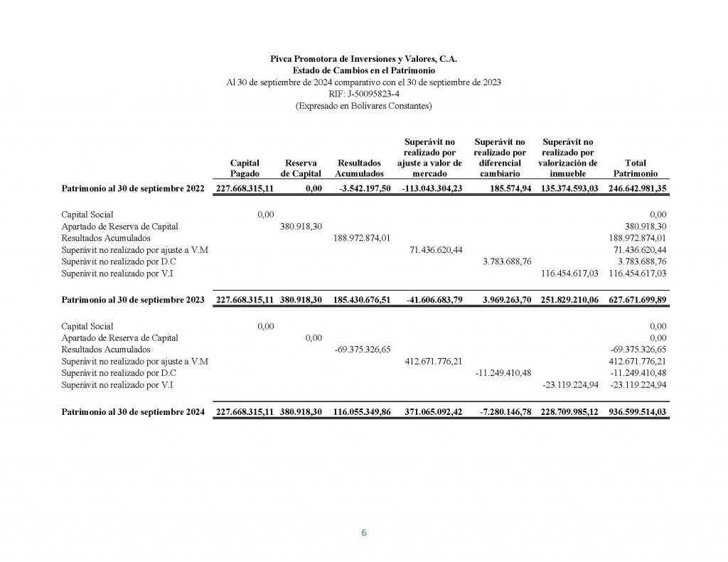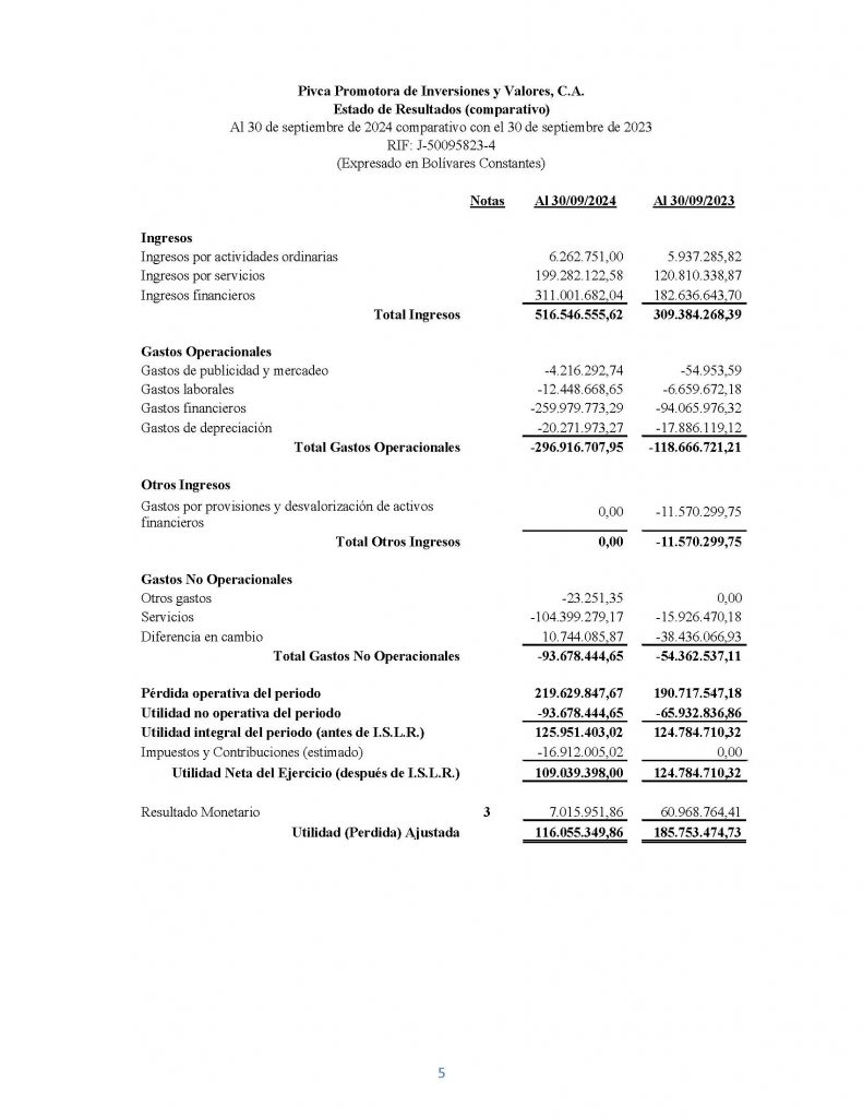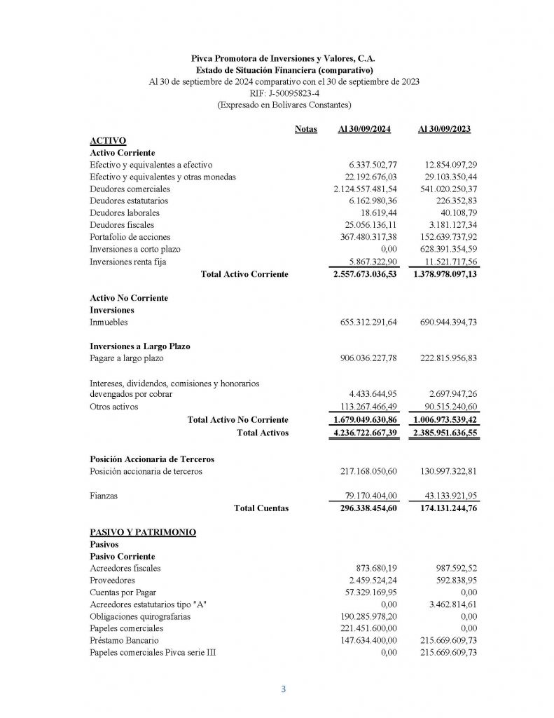 PIVCA PROMOTORA DE INVERSIONES Y VALORES, C. A. INFORMACIÓN FINANCIERA “ESTADOS FINANCIEROS NO AUDITADOS 3er TRIMESTRE 2024-2023”