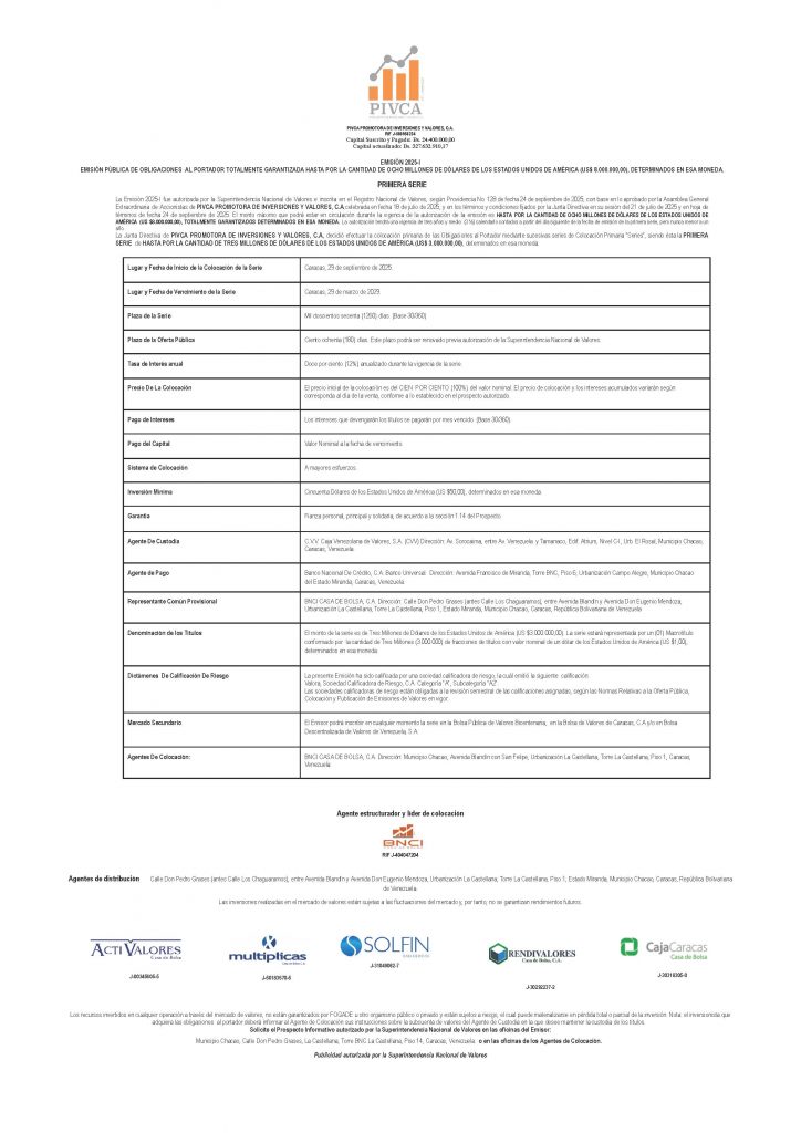 Los títulos para colocar son los correspondiente, a la Serie I, de la Emisión 2025-I, de Obligaciones al Portador Totalmente Garantizadas, emitidas por la Empresa Emisora PIVCA PROMOTORA DE INVERSIONES Y VALORES, C.A. por un monto de (USD$ 3.000.000,00).