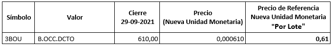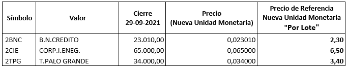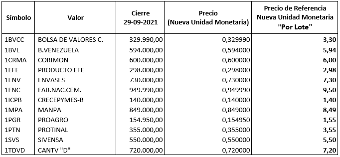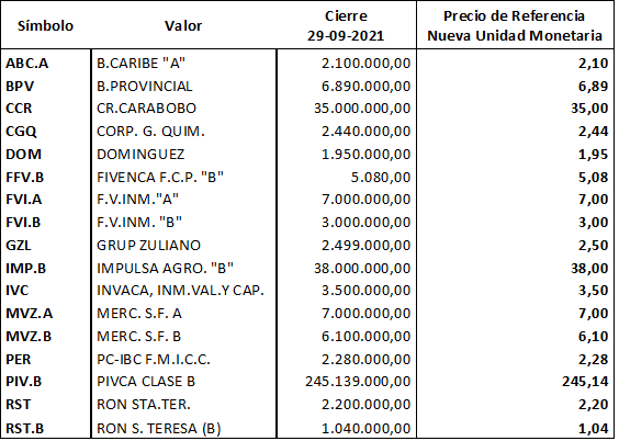 Se notifica a los Señores Miembros y público en general que, según lo acordado por la junta directiva de la Bolsa de Valores de Caracas, en su sesión No. 1.648, celebrada el 12 de agosto de 2021, tomando como referencia el Decreto Presidencial N° 4.553 del 6 de agosto de 2021, a partir del 1° de octubre de 2021 se expresará la unidad del sistema monetario de la República Bolivariana de Venezuela, en el equivalente a un millón de bolívares actuales (Bs 1.000.000) y el bolívar resultante de esta nueva expresión continuará representándose con el símbolo “Bs”, siendo divisible en cien (100) céntimos, a continuación se establecen los precios de referencia para los valores inscritos en pizarra de cotizaciones, para el 04 de octubre de 2021.