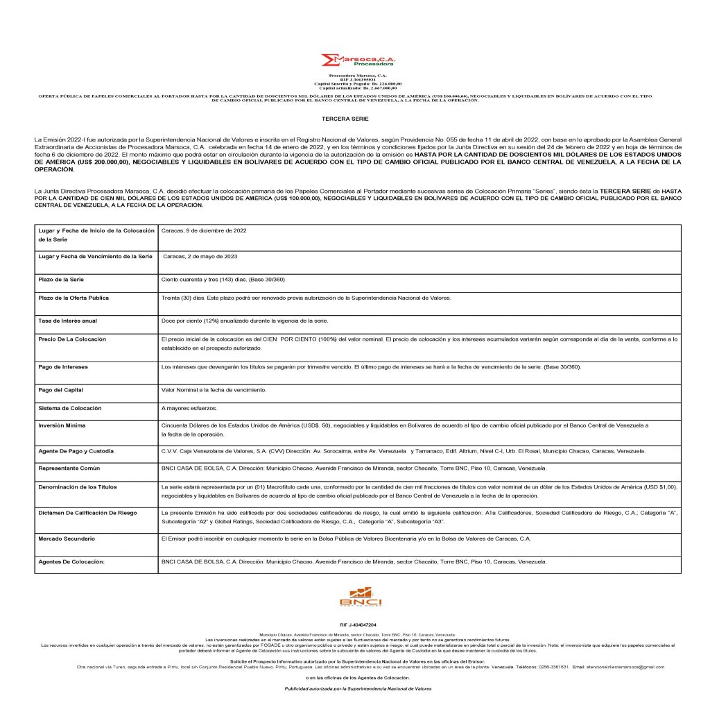 Colocación Primaria de Papeles Comerciales al Portador Emisión 2022-I Serie III Monto US$. 100.000,00 Negociable y Liquidables en Bolívares de acuerdo con el tipo de cambio Oficial Publicado por el BANCO CENTRAL DE VENEZUELA, a la fecha de la Operación.