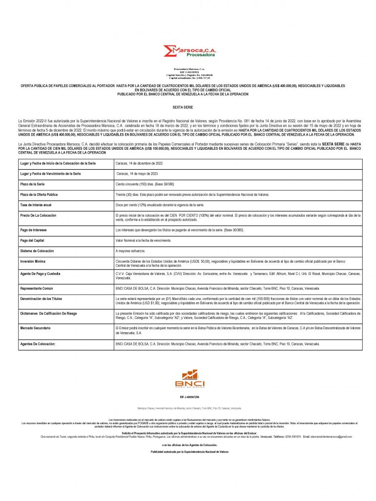 Colocación Primaria de Papeles Comerciales al Portador Emisión 2022-II Serie VI Monto US$. 100.000,00 Negociable y Liquidables en Bolívares de acuerdo con el tipo de cambio Oficial Publicado por el BANCO CENTRAL DE VENEZUELA, a la fecha de la Operación.