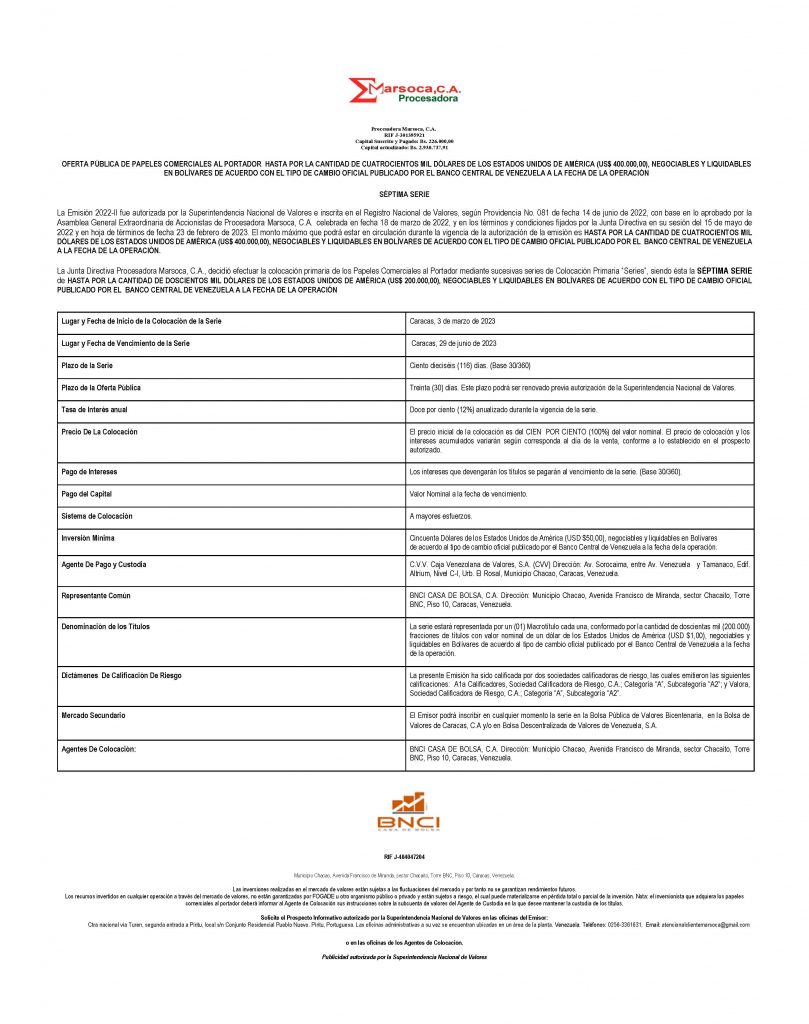 PROCESADORA MARSOCA, C. A. EMISIÓN 2022-II PAPELES COMERCIALES AL PORTADOR