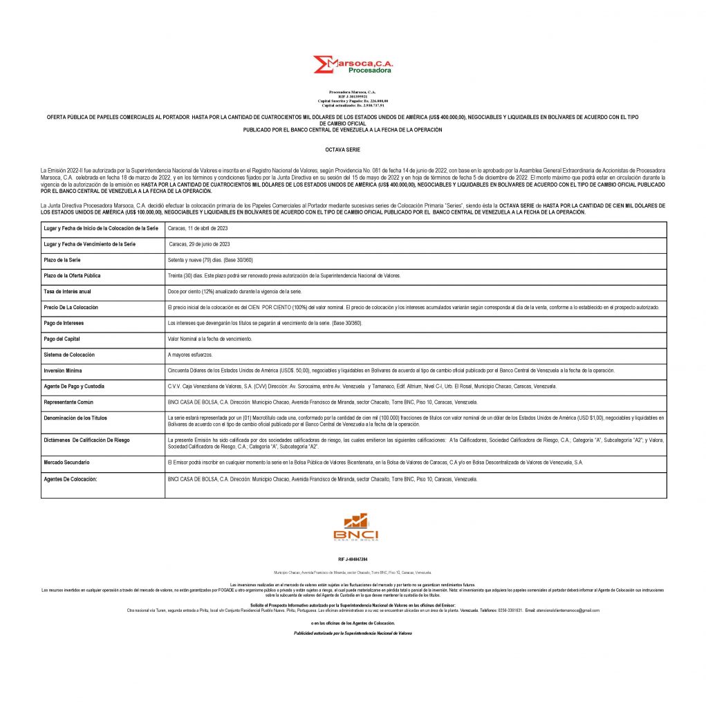Los títulos para colocar son los correspondiente a la Serie VIII, de la Emisión 2022-II, de Papeles Comerciales al Portador, emitidos por la Empresa Emisora PROCESADORA MARSOCA, C. A., con denominación en dólares de los Estados Unidos de América (USD$). Negociable y Liquidables en Bolívares.