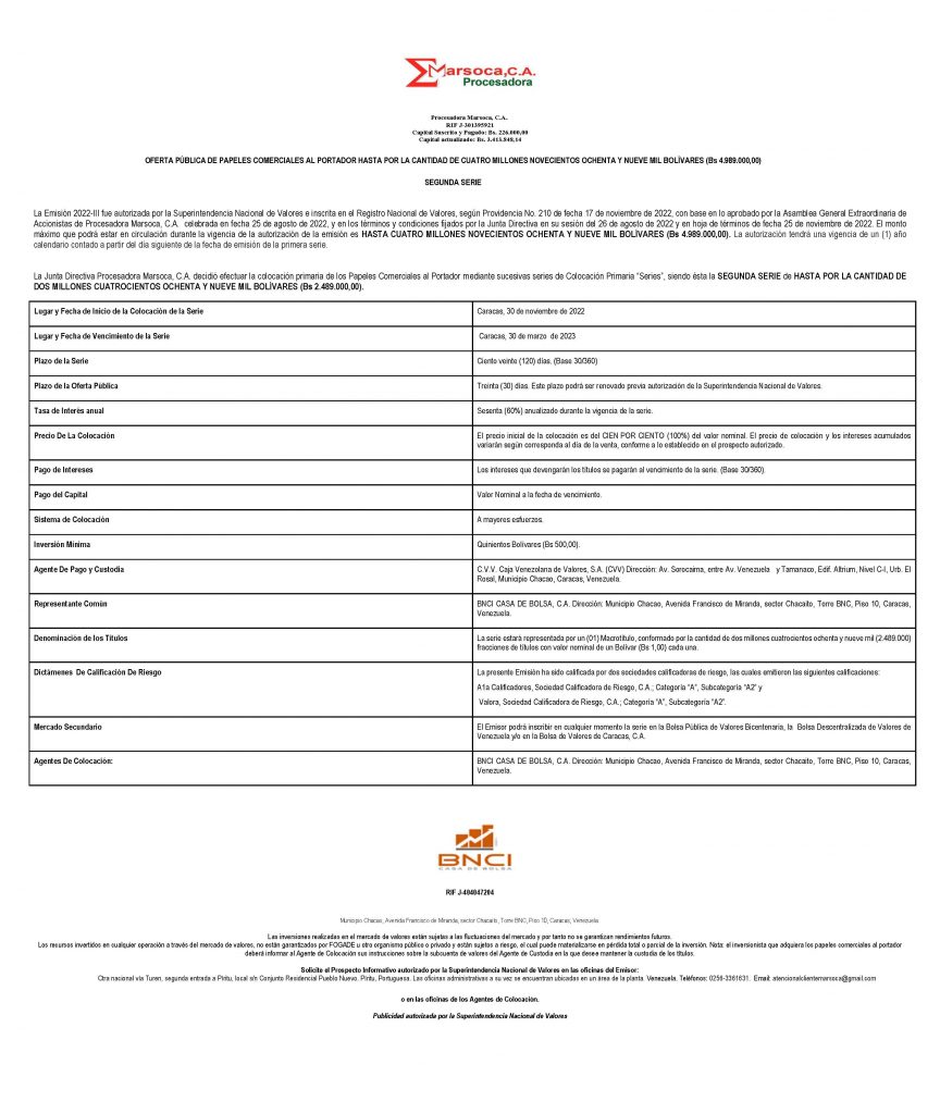 Los títulos para colocar son los correspondiente a la Serie II, de la Emisión 2022-III, de Papeles Comerciales al Portador, emitidos por la Empresa Emisora PROCESADORA MARSOCA, C. A.