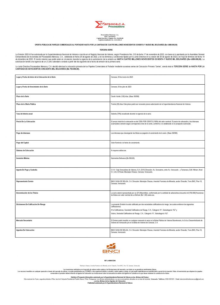 Los títulos para colocar son los correspondiente a la Serie III, de la Emisión 2022-III, de Papeles Comerciales al Portador, emitidos por la Empresa Emisora PROCESADORA MARSOCA, C. A.
