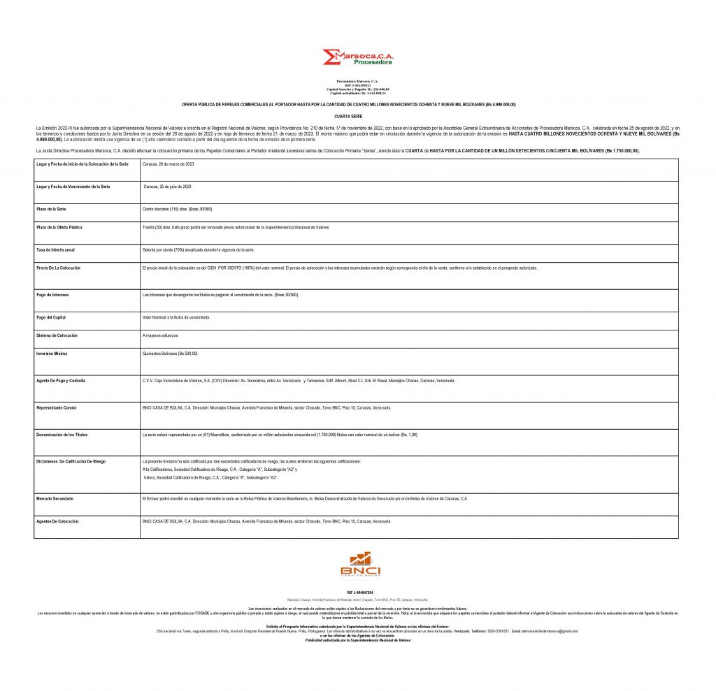 Los títulos para colocar son los correspondiente a la Serie IV, de la Emisión 2022-III, de Papeles Comerciales al Portador, emitidos por la Empresa Emisora PROCESADORA MARSOCA, C. A.
