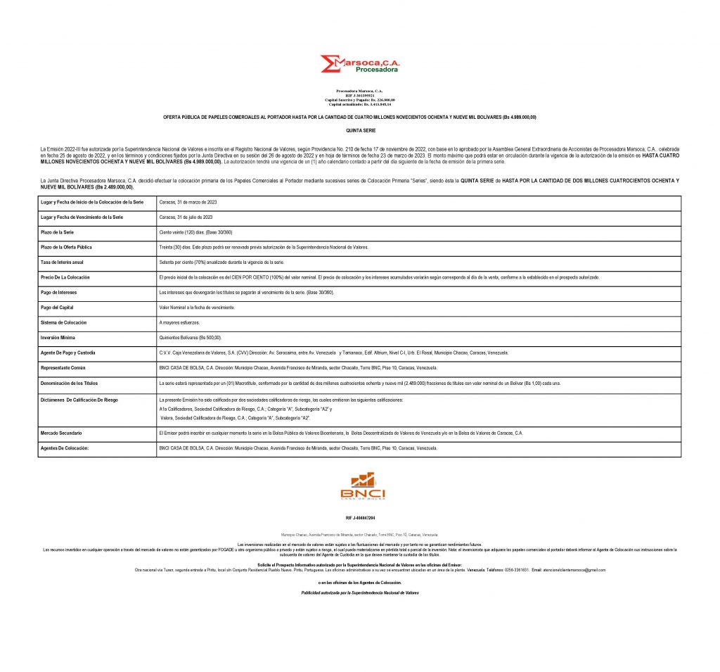 Los títulos para colocar son los correspondiente a la Serie V, de la Emisión 2022-III, de Papeles Comerciales al Portador, emitidos por la Empresa Emisora PROCESADORA MARSOCA, C. A.