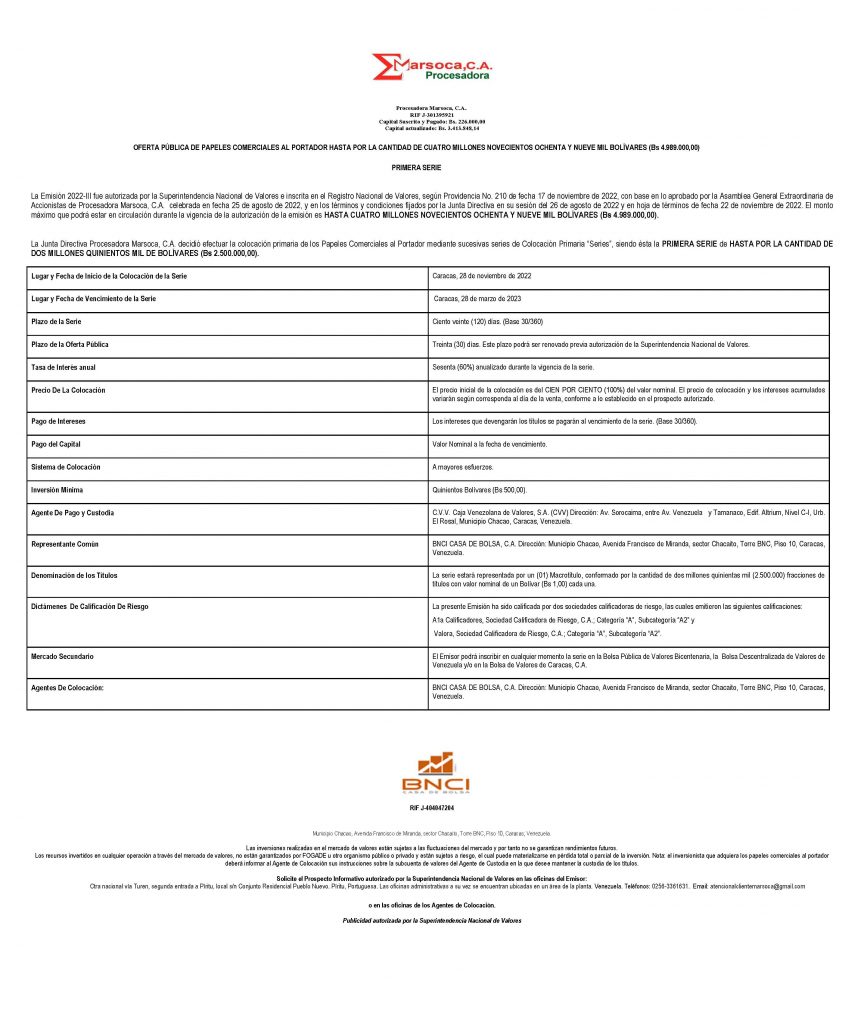 PROCESADORA MARSOCA, C. A. EMISIÓN 2022-III