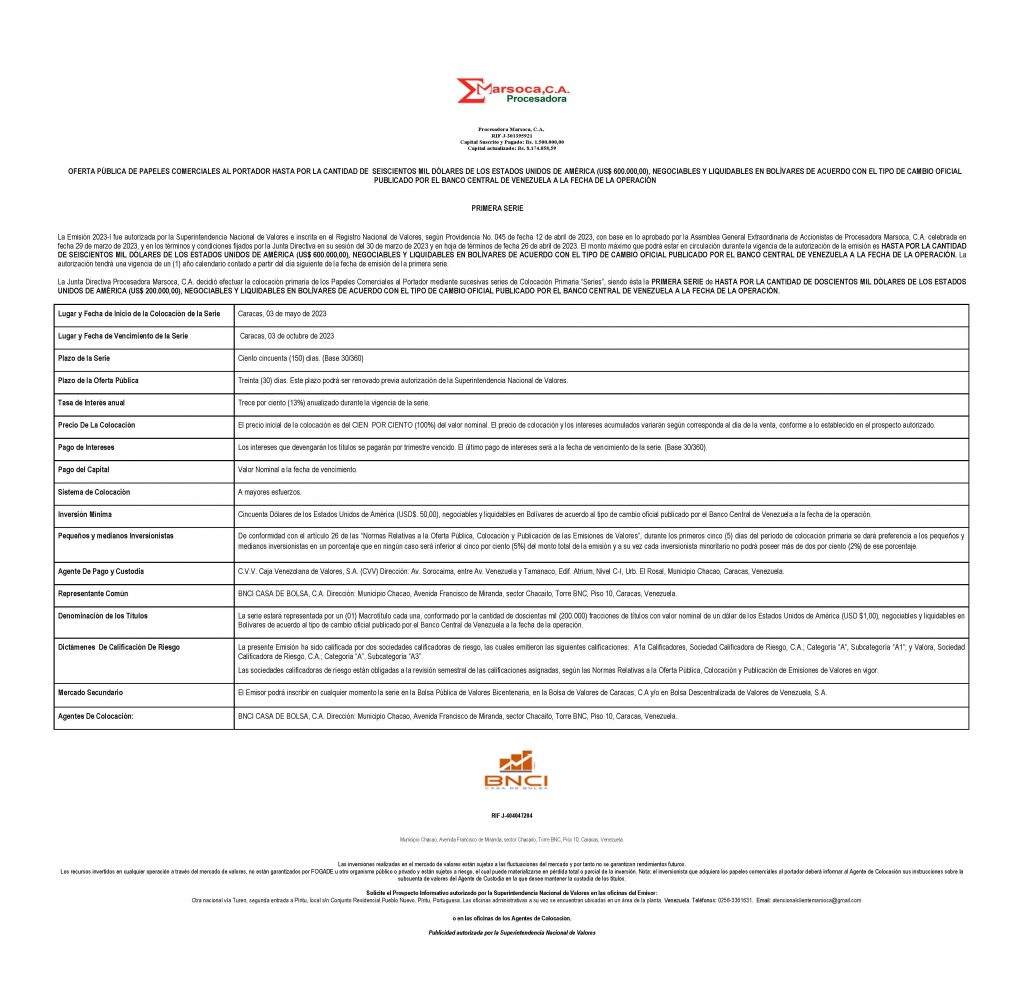 Colocación Primaria de Papeles Comerciales al Portador Emisión 2023-I Serie I Monto USD$ 200.000,00 NEGOCIABLES Y LIQUIDABLES EN BOLÍVARES DE ACUERDO CON EL TIPO DE CAMBIO OFICIAL PUBLICADO POR EL BANCO CENTRAL DE VENEZUELA A LA FECHA DE LA OPERACIÓN