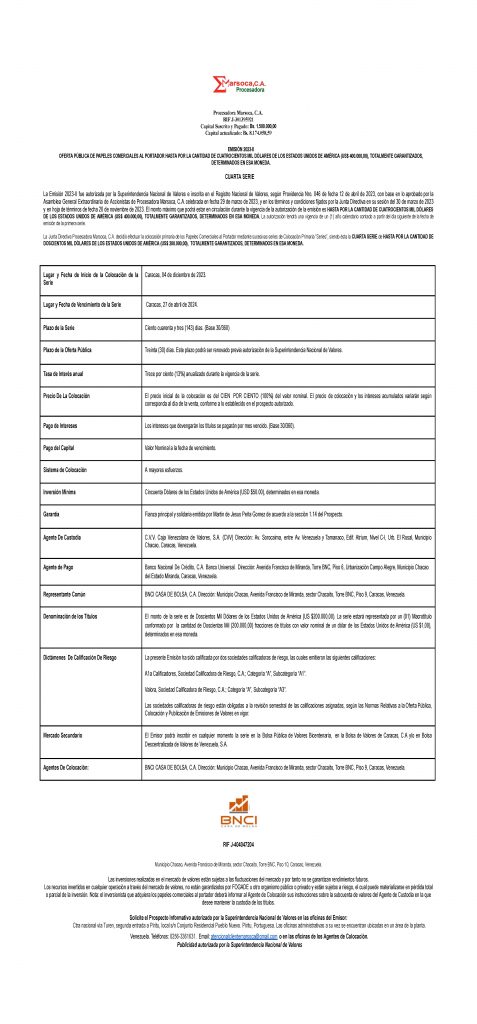 | Emisor | PROCESADORA MARSOCA, C. A. |