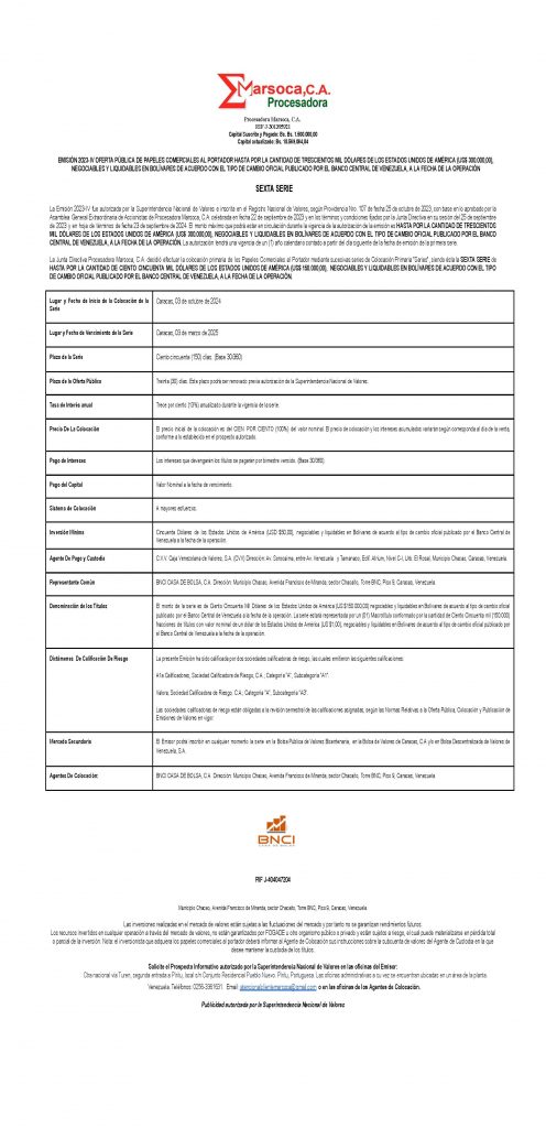 PROCESADORA MARSOCA, C. A. EMISIÓN 2023-IV SERIE VI PAPELES COMERCIALES AL PORTADOR