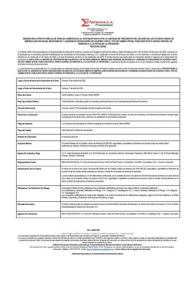 Colocación Primaria de Papeles Comerciales al Portador Emisión 2025-II Serie III Monto USD$ 150.000,00 NEGOCIABLES Y LIQUIDABLES EN BOLÍVARES DE ACUERDO CON EL TIPO DE CAMBIO OFICIAL PUBLICADO POR EL BANCO CENTRAL DE VENEZUELA, A LA FECHA DE LA OPERACIÓN