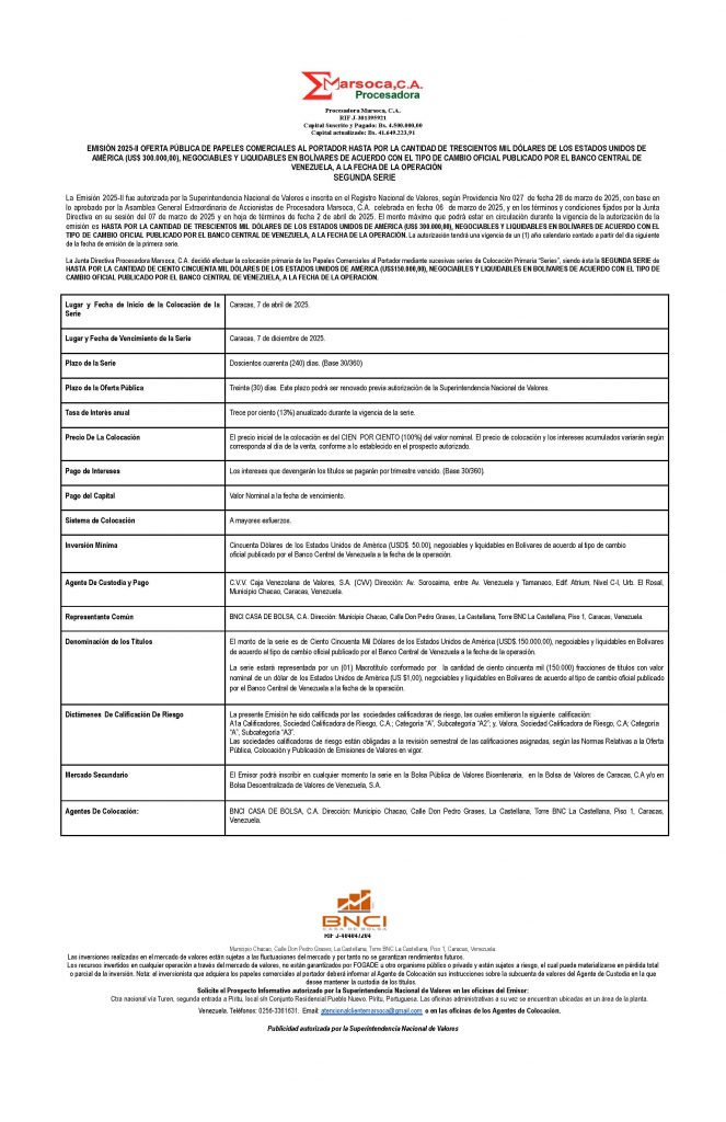 Los títulos para colocar son los correspondiente a la Serie II, de la Emisión 2025-II, de Papeles Comerciales al Portador, emitidos por la Empresa Emisora PROCESADORA MARSOCA, C. A. Negociables y Liquidables en bolívares.