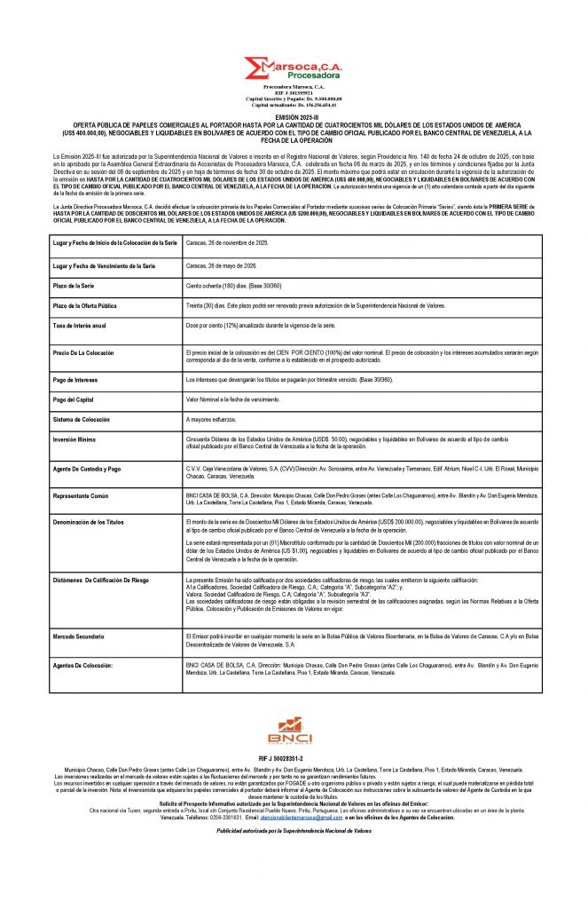 Los títulos para colocar son los correspondiente a la Serie I, de la Emisión 2025-III, de Papeles Comerciales al Portador, emitidos por la Empresa Emisora PROCESADORA MARSOCA, C. A. Negociables y liquidables en bolívares.