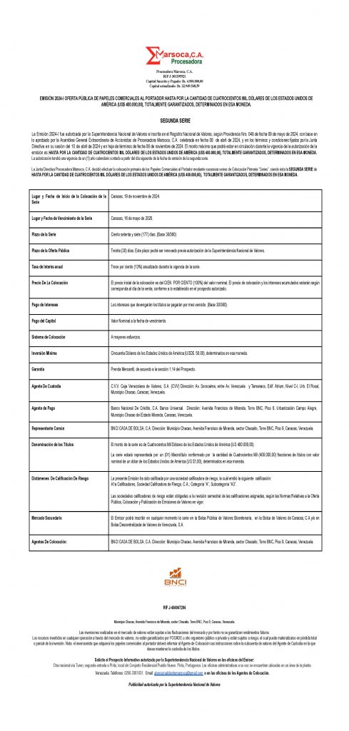 PROCESADORA MARSOCA, C. A., PAPELES COMERCIALES AL PORTADOR TOTALMENTE GARANTIZADOS EMISIÓN 2024-I SERIE II