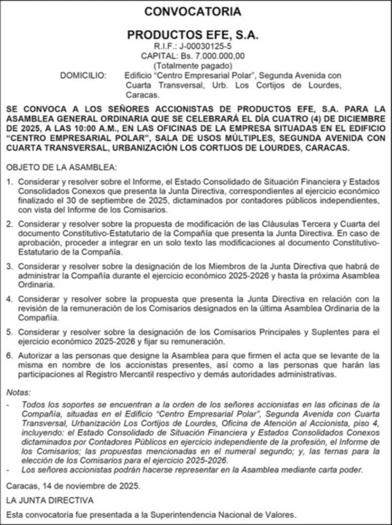 PRODUCTOS EFE, S.A. ASAMBLEA GENERAL ORDINARIA DE ACCIONISTA A CELEBRARSE EL 4 DE DICIEMBRE DE 2025