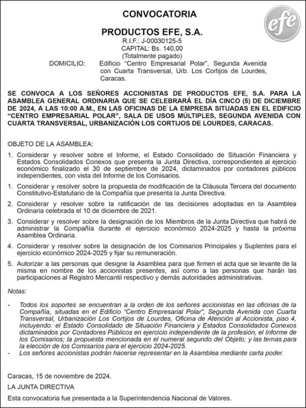 PRODUCTOS EFE, S.A. ASAMBLEA GENERAL ORDINARIA DE ACCIONISTA A CELEBRARSE EL 5 DE DICIEMBRE DE 2024