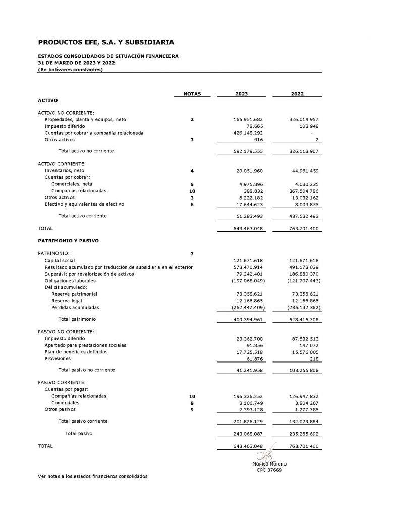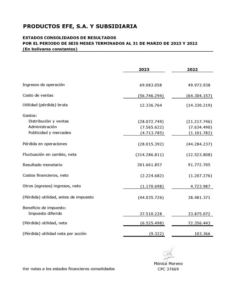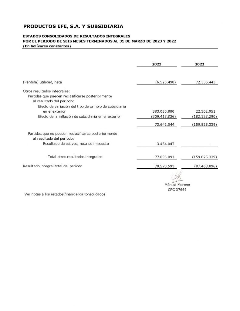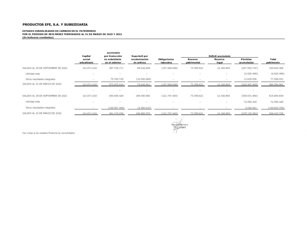 PRODUCTOS EFE S.A., INFORMACIÓN FINANCIERA TRIMESTRAL MARZO 2023 Y 2022 (No Auditado)