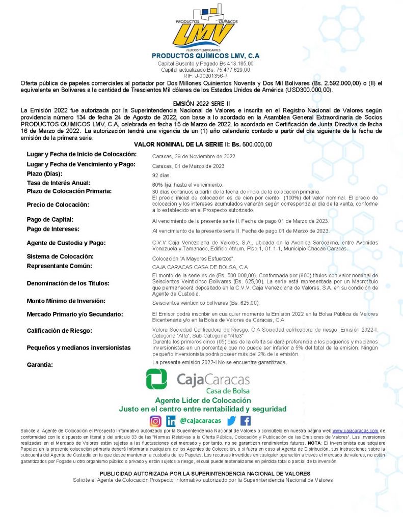 Los títulos para colocar son los correspondientes a la Serie II, de la Emisión 2022, de Papeles Comerciales al Portador, emitidos por la Empresa Emisora PRODUCTOS QUIMICOS L.M.V., C.A.