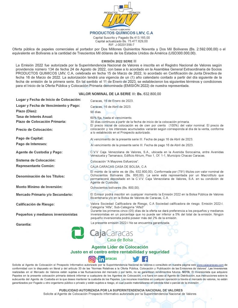 Los títulos para colocar son los correspondientes a la Serie III, de la Emisión 2022, de Papeles Comerciales al Portador, emitidos por la Empresa Emisora PRODUCTOS QUIMICOS L.M.V. C.A.