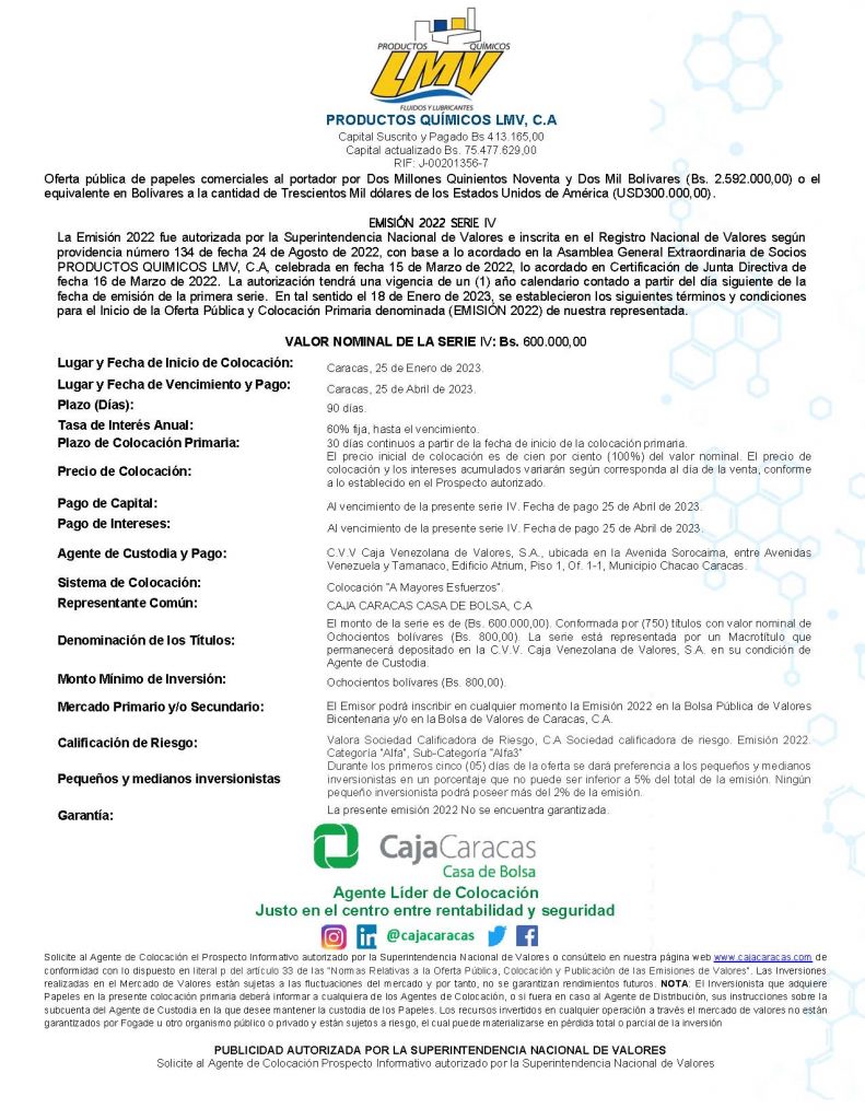 PRODUCTOS QUIMICOS L.M.V., C.A., EMISIÓN 2022 PAPELES COMERCIALES AL PORTADOR
