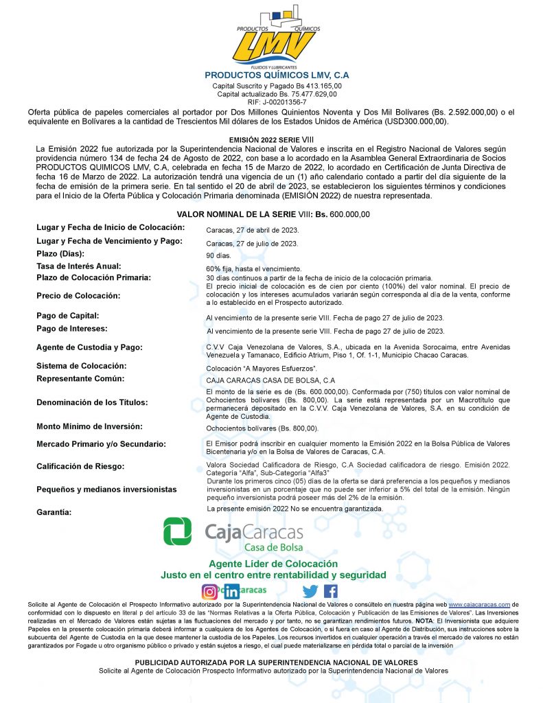 Los títulos para colocar son los correspondientes a la Serie VIII, de la Emisión 2022, de Papeles Comerciales al Portador, emitidos por la Empresa Emisora PRODUCTOS QUIMICOS L.M.V., C.A.
