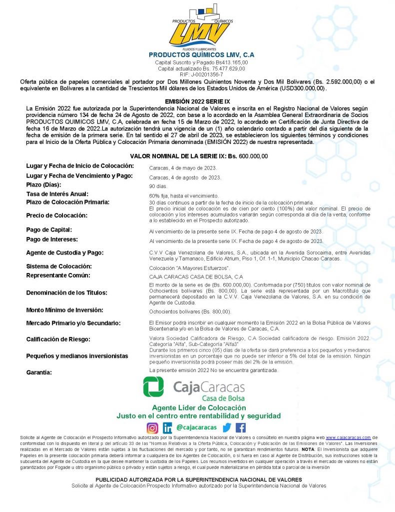 Los títulos para colocar son los correspondientes a la Serie IX, de la Emisión 2022, de Papeles Comerciales al Portador, emitidos por la Empresa Emisora PRODUCTOS QUIMICOS L.M.V., C.A.
