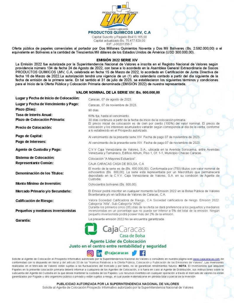 Los títulos para colocar son los correspondientes a la Serie XIV, de la Emisión 2022, de Papeles Comerciales al Portador, emitidos por la Empresa Emisora PRODUCTOS QUIMICOS L.M.V., C.A.