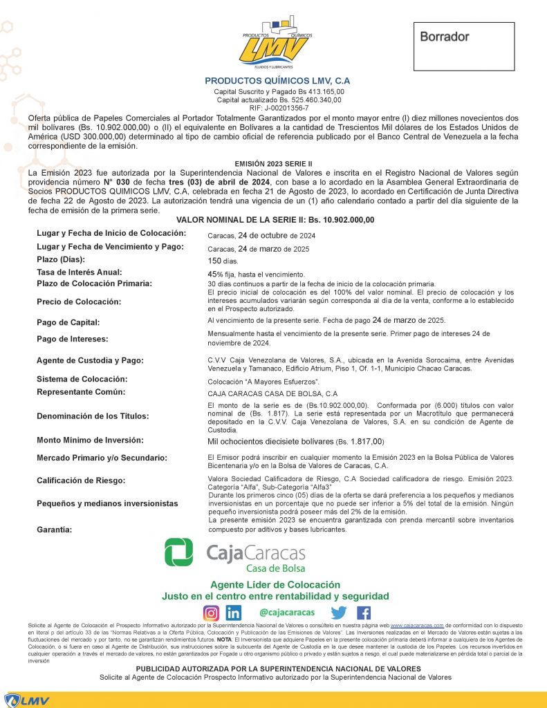 Los títulos para colocar son los correspondientes a la Serie II, de la Emisión 2023, de Papeles Comerciales al Portador, emitidos por la Empresa Emisora PRODUCTOS QUIMICOS L.M.V., C.A.