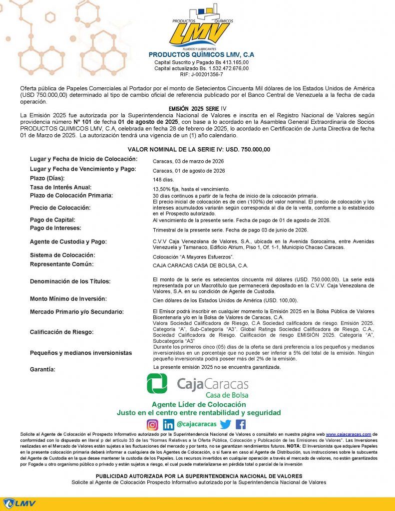 PRODUCTOS QUIMICOS L.M.V., C.A. EMISIÓN 2025 SERIE IV PAPELES COMERCIALES AL PORTADOR