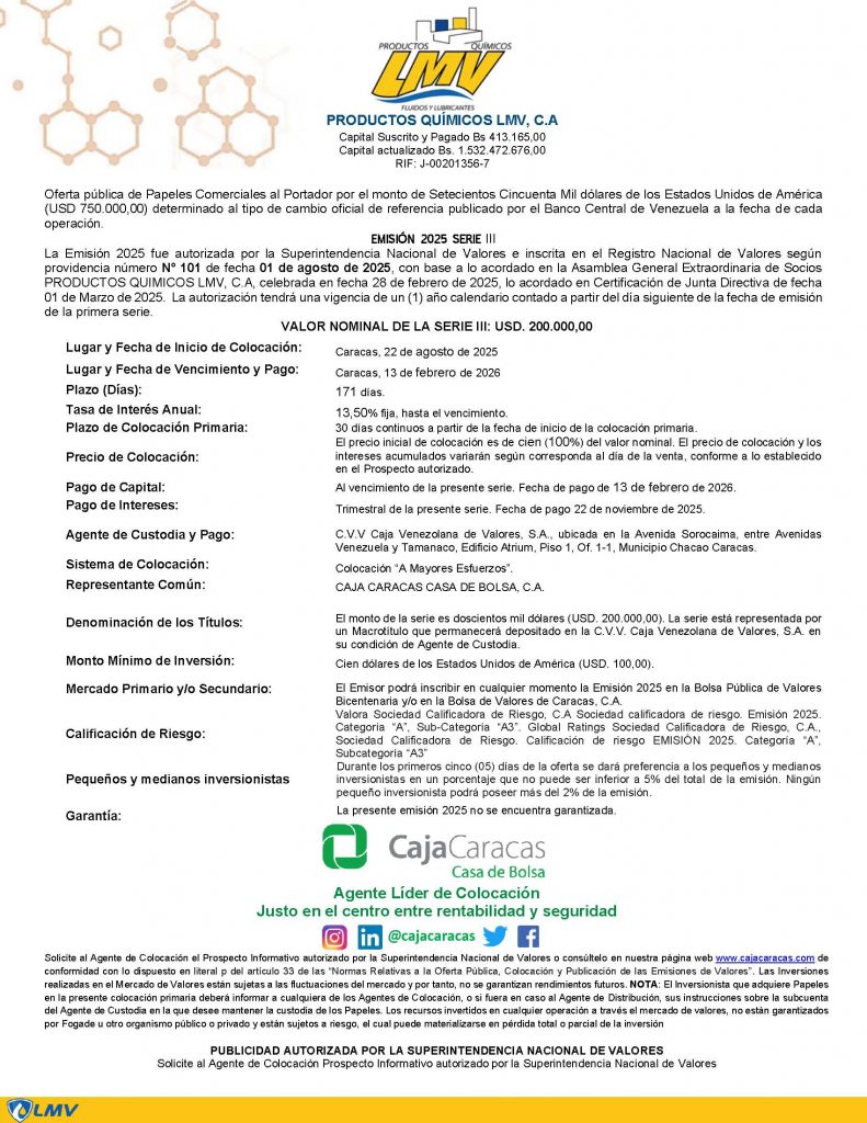 Los títulos para colocar son los correspondientes a la Serie III, de la Emisión 2025, de Papeles Comerciales al Portador, emitidos por la Empresa Emisora, PRODUCTOS QUIMICOS L.M.V., C.A., determinado al tipo de cambio oficial.