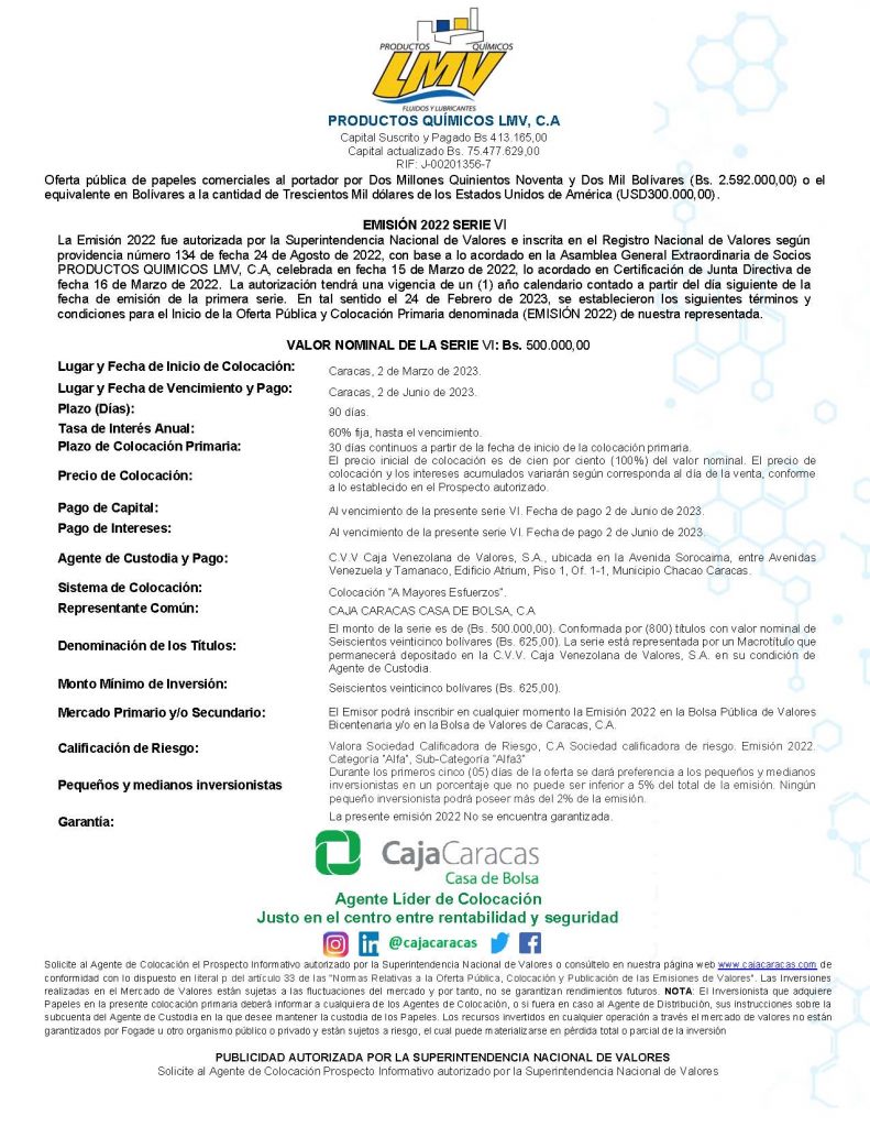 Los títulos para colocar son los correspondientes a la Serie VI, de la Emisión 2022, de Papeles Comerciales al Portador, emitidos por la Empresa Emisora PRODUCTOS QUIMICOS L.M.V., C.A.