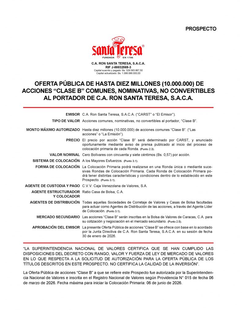 PROSPECTO OFERTA PÚBLICA DE ACCIONES CLASE “B” COMUNES, NOMINATIVAS,NO CONVERTIBLES AL PORTADOR PROVIDENCIA 015-2026 (C.A. Ron Santa Teresa S.A.C.A.)