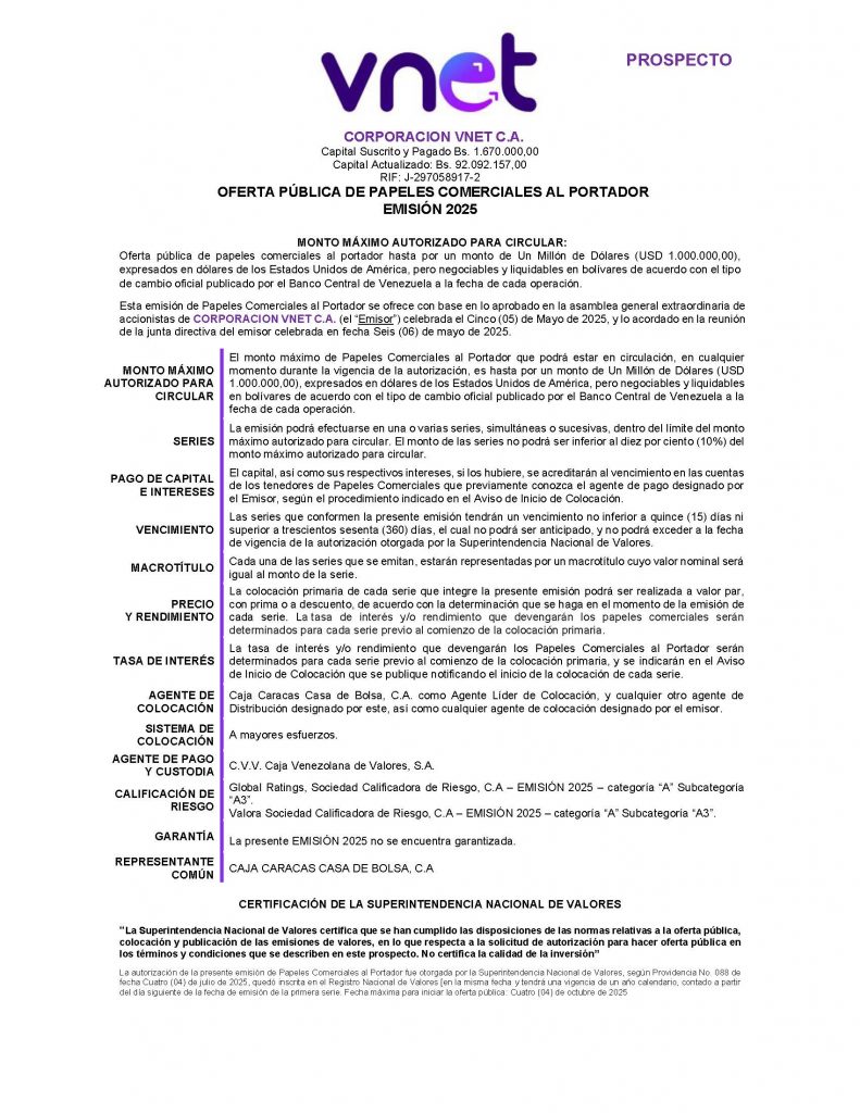 CORPORACIÓN VNET CA OFERTA PÚBLICA DE PAPELES COMERCIALES AL PORTADOR EMISIÓN 2025 HASTA POR UN MONTO DE UN MILLÓN DE DÓLARES USD$ 1.000.000,00 EXPRESADOS EN DÓLARES DE LOS ESTADOS UNIDOS DE AMÉRICA, PERO NEGOCIABLES Y LIQUIDABLES EN BOLIVARES AL TIPO DE CAMBIO OFICIAL POR EL BANCO CENTRAL DE VENEZUELA A LA FECHA DE CADA OPERACIÓN