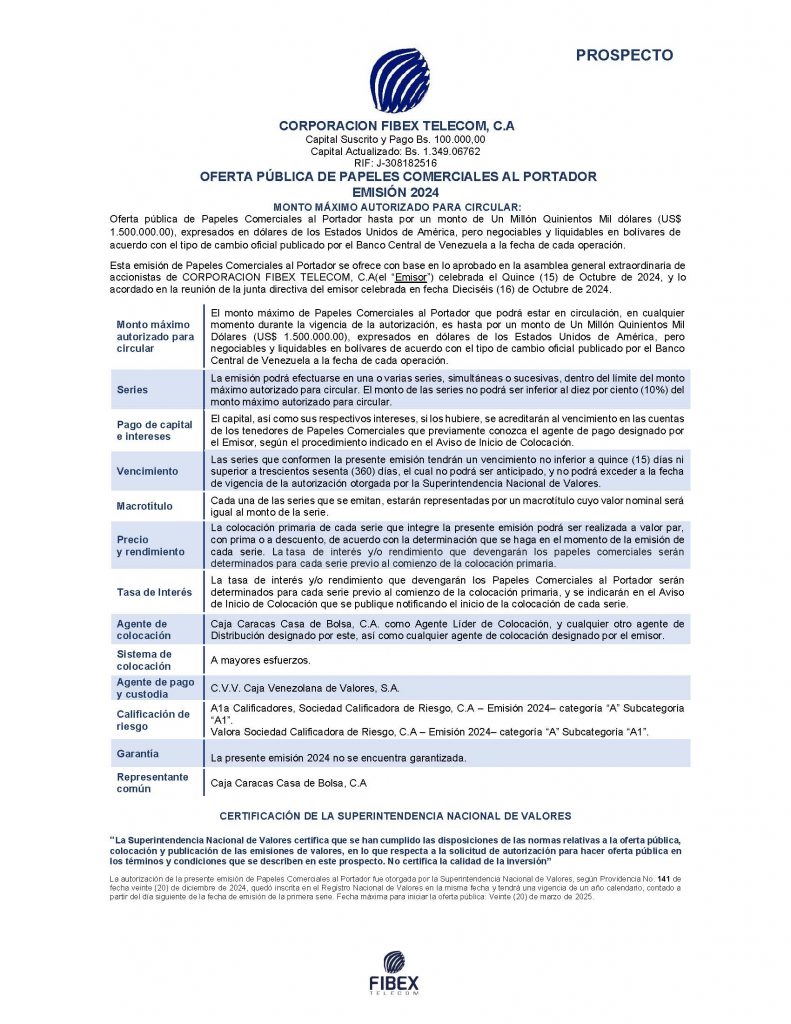 CORPORACION FIBEX TELECOM, C.A., PAPELES COMERCIALES AL PORTADOR EMISIÓN 2024- MONTO USD$ 1.500.000,00 NEGOCIABLES Y LIQUIDABLES EN BOLÍVARES CALCULADO AL TIPO DE CAMBIO OFICIAL PUBLICADO POR EL BANCO CENTRAL DE VENEZUELA, A LA FECHA DE LA OPERACIÓN