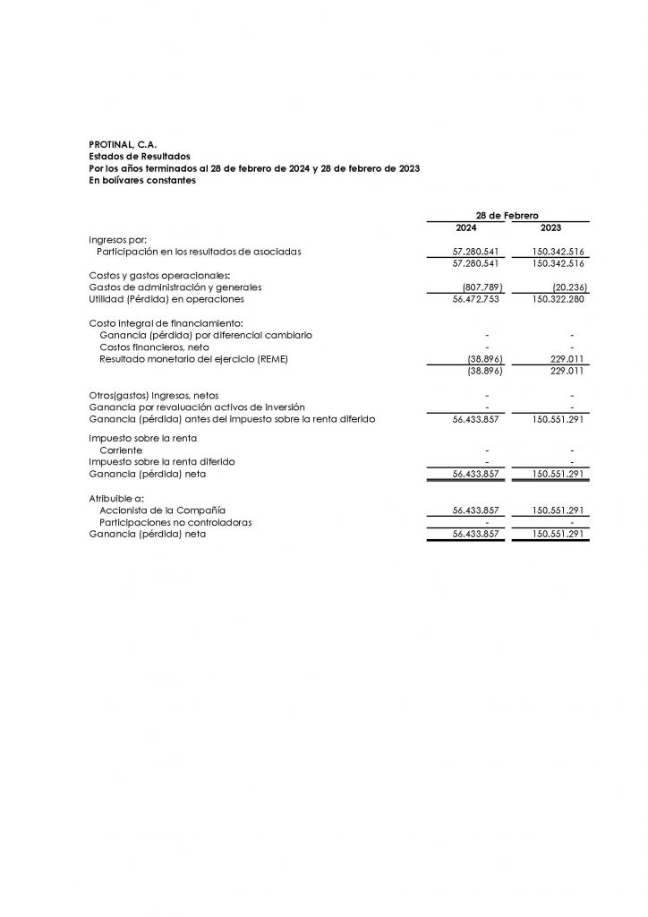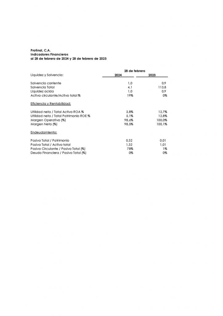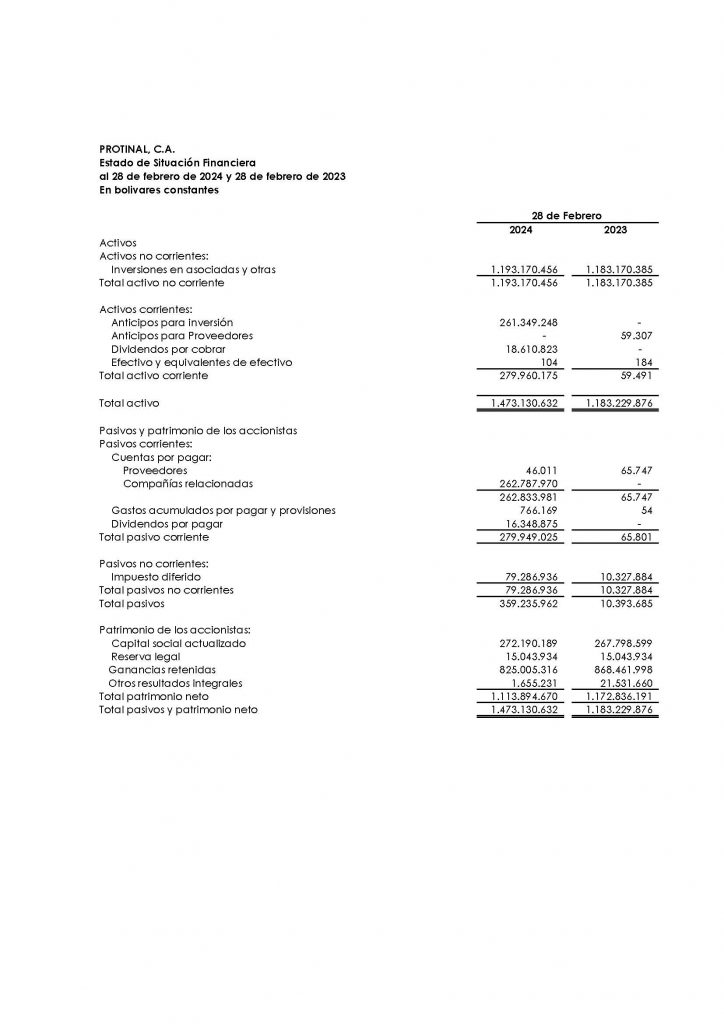 PROTINAL, C.A. INFORMACIÓN FINANCIERA AL 28 DE FEBRERO DE 2024-2023 (No Auditada)