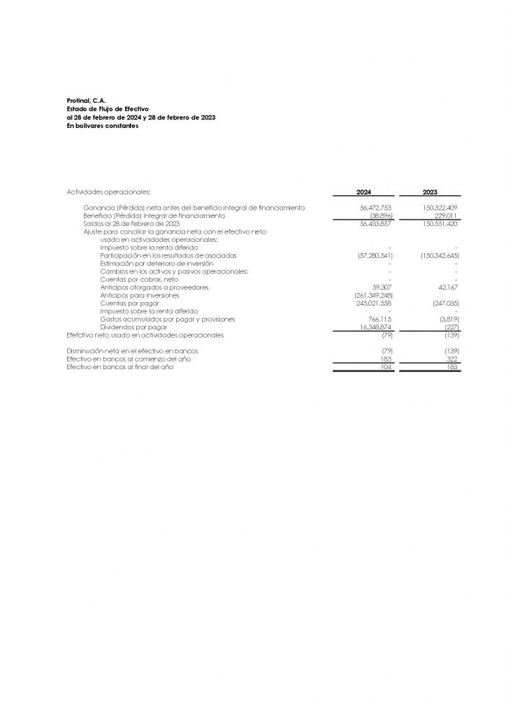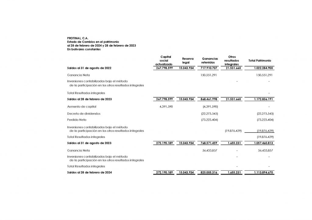Estado de Situación Financiera, Estado de Resultados, Estado de cambios en el Patrimonio, Estado de Flujo de Efectivo y Principales Indicadores Financieros al 28 de febrero de 2024 comparativo con el 28 de febrero de 2023 de PROTINAL C.A