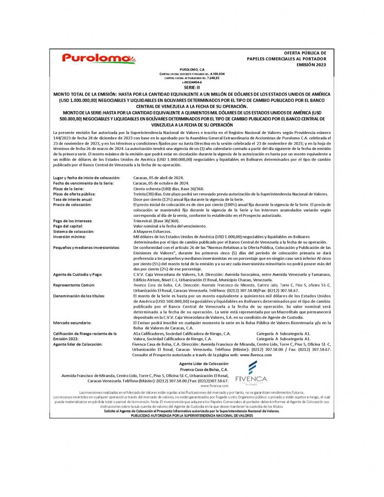 Los títulos para colocados son los correspondientes a la Serie II, de la Emisión 2023 de Papeles Comerciales al Portador, emitidos por la Empresa Emisora PUROLOMO, C.A.