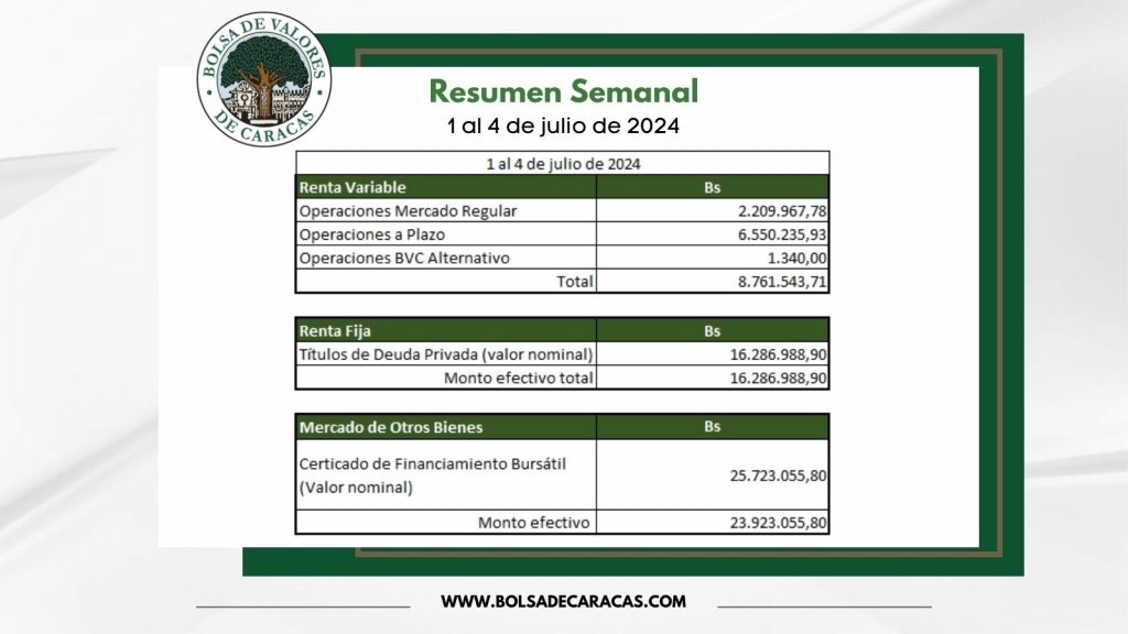 En la Bolsa de Valores de Caracas, entre el 1 y el 4 de julio de 2024, se negoció un total de 48 millones 971 mil 588 bolívares.