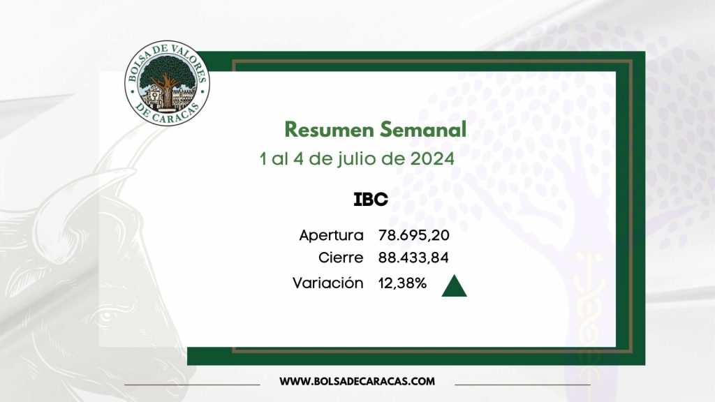 El índice principal de la Bolsa de Valores de Caracas, IBC, abrió el lapso en 78.695,20 puntos y lo cerró en 88.433,84 puntos, con una variación de 9.738,64 puntos (+12,38%) en 4 días de operaciones. En lo que va de año, este indicador registra una variación de 30.601,38 puntos (+52,91%).