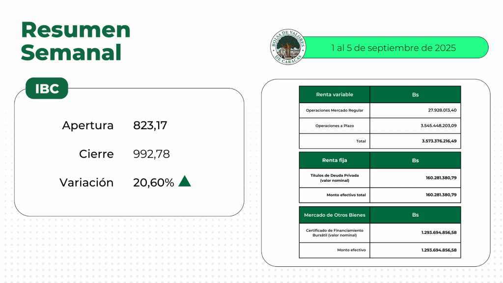 En la Bolsa de Valores de Caracas, entre el 1 y el 5 de septiembre de 2025, se negoció un total de Bs 5.027.352.453,86.