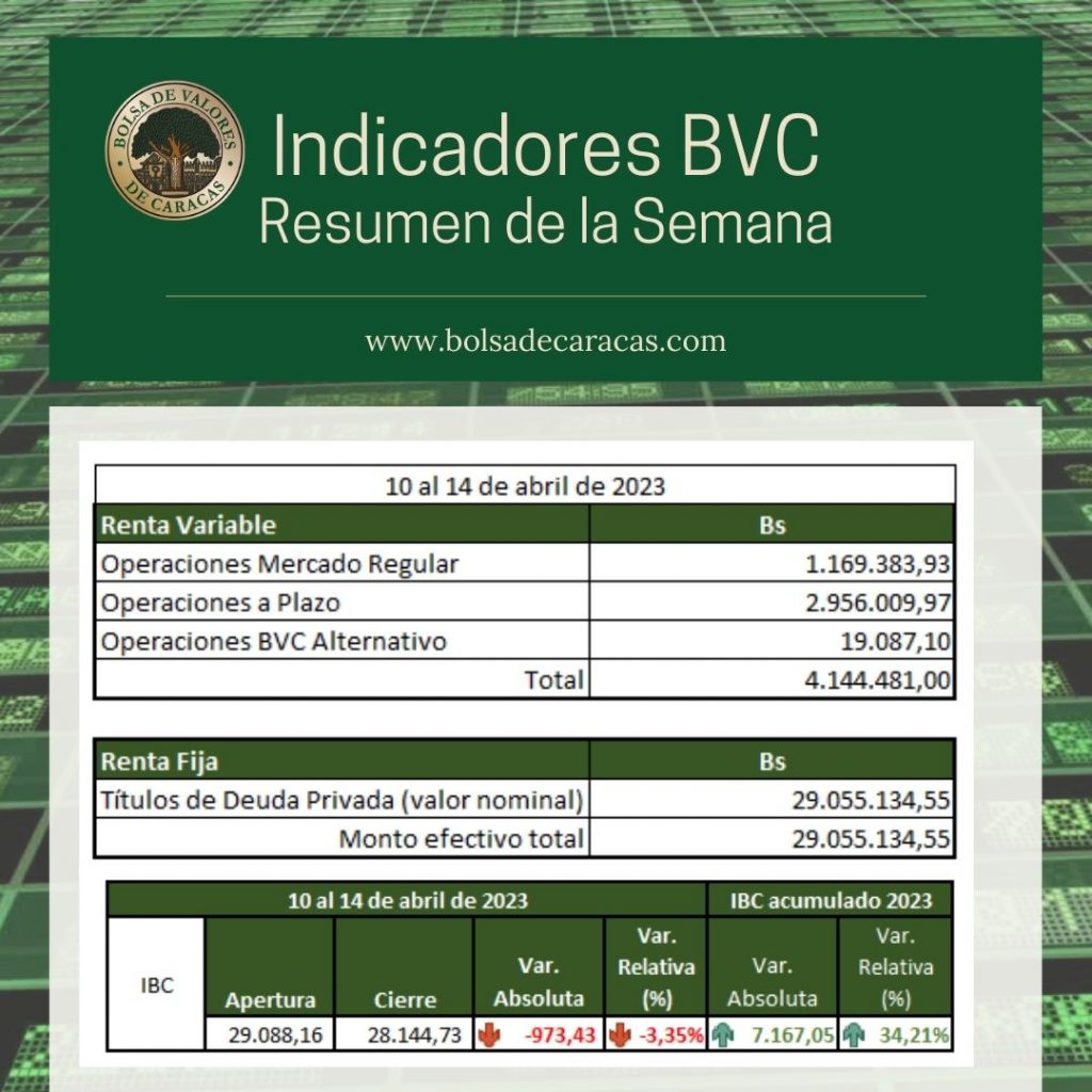 El índice principal de la Bolsa de Valores de Caracas, IBC, abrió el lapso en 29.088,16 puntos y lo cerró en 28.144,73 puntos, con una variación de -973,43 puntos (-3,35%) en 5 días de operaciones. En lo que va de año, este indicador registra una variación de 7.167,05 puntos (+34,21%).
