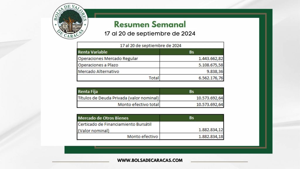 En la Bolsa de Valores de Caracas, entre el 17 y el 20 de septiembre de 2024, se negoció un total de 19 millones 018 mil 703 bolívares.