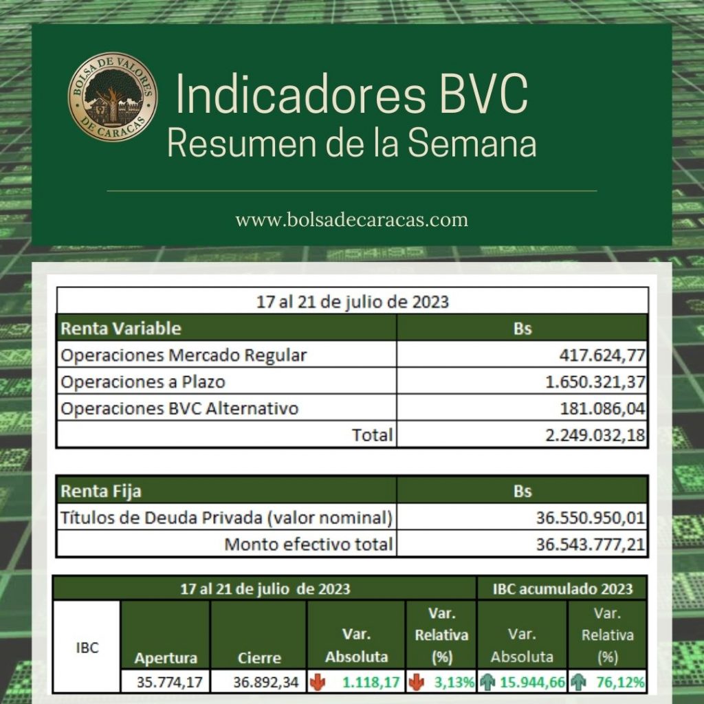 En la Bolsa de Valores de Caracas, entre el 17 y el 21 de julio de 2023, se negoció un total de 38 millones 792 mil 809 bolívares.