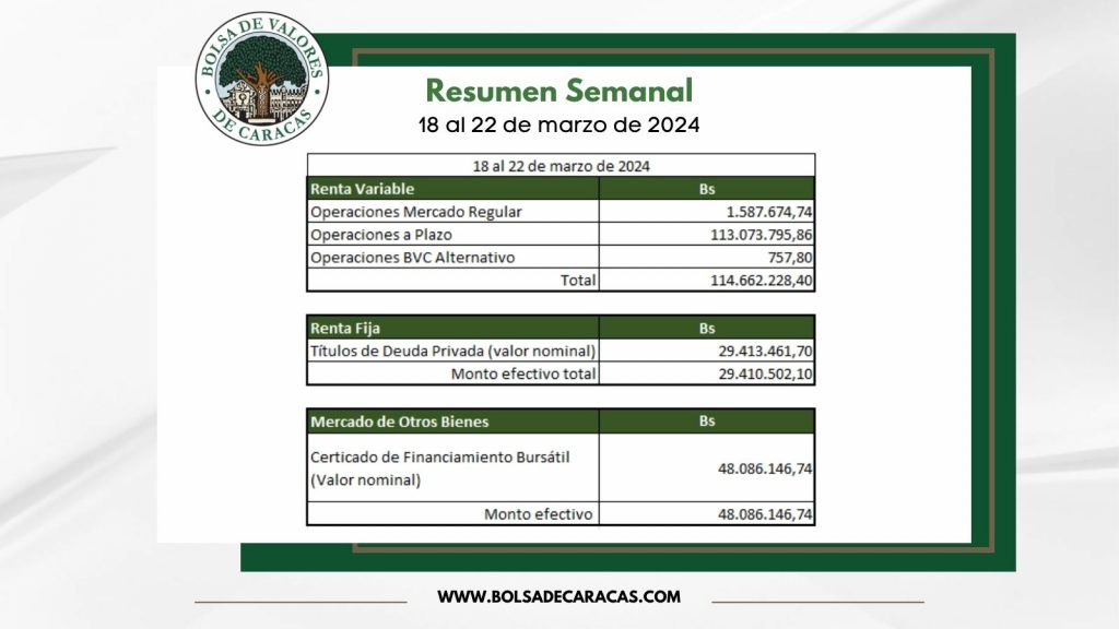 En la Bolsa de Valores de Caracas, entre el 18 y el 22 de marzo de 2024, se negoció un total de 192 millones 158 mil 877 bolívares.