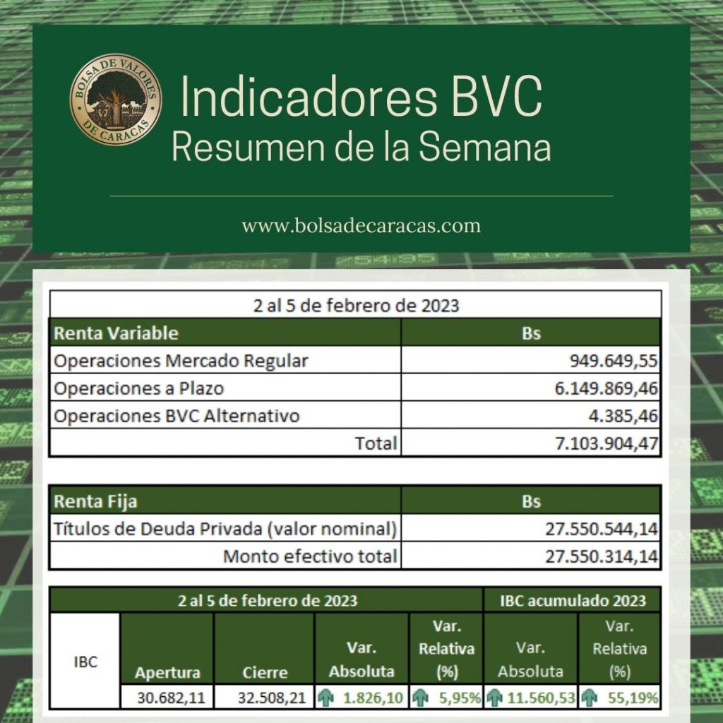 El índice principal de la Bolsa de Valores de Caracas, IBC, abrió el lapso en 30.682,11 puntos y lo cerró en 32.508,21 puntos, con una variación de 1.826,10 puntos (+5,95%) en 4 días de operaciones. En lo que va de año, este indicador registra una variación de 11.560,53 puntos (+55,19%).