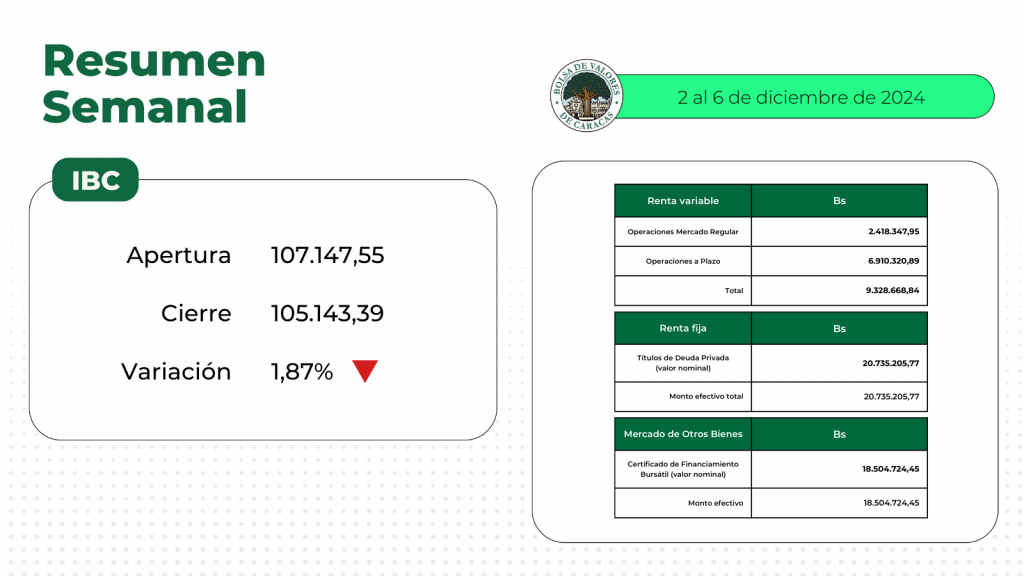 En la Bolsa de Valores de Caracas, entre el 2 y el 6 de diciembre de 2024, se negoció un total de 48 millones 568 mil 599 bolívares.