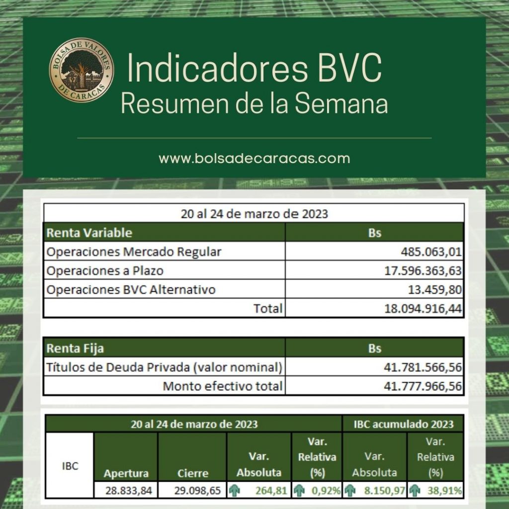 El índice principal de la Bolsa de Valores de Caracas, IBC, abrió el lapso en 28.833,84 puntos y lo cerró en 29.098,65 puntos, con una variación de +264,81 puntos (+0,92%) en 5 días de operaciones. En lo que va de año, este indicador registra una variación de 8.150,97 puntos (+38,91%).